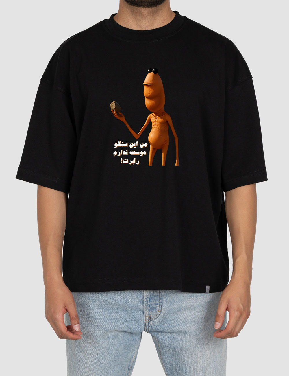 تیشرت باکسی مارکوس و سنگ از برند هیوان با چاپ خاص و ترند این روزها طراحی شده است. این طرح الهامگرفته از یکی از ویدیوهای محبوب اینترنتی است که روی آن صداگذاریهای طنز انجام میشود.