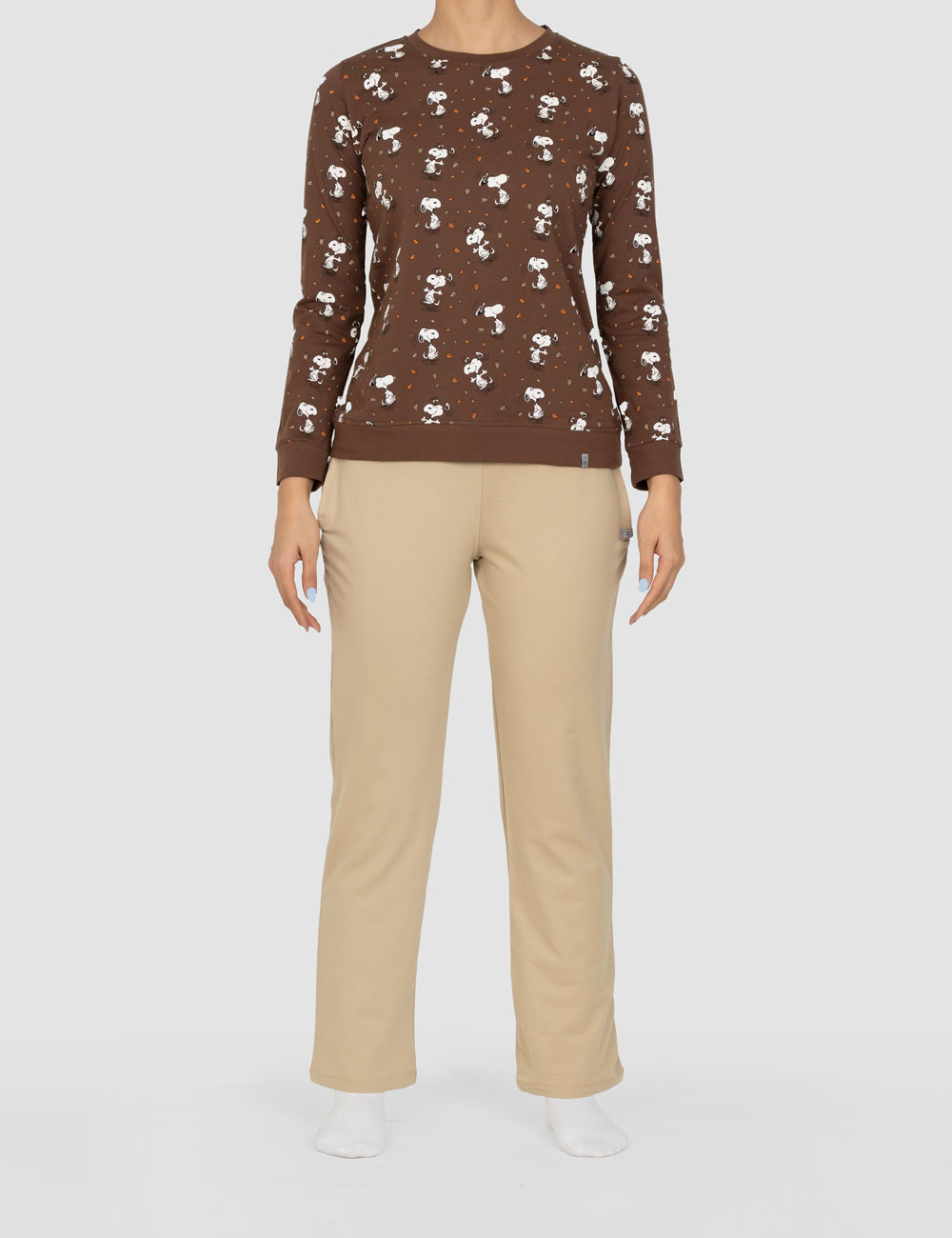 شلوار زنانه اسنوپی و برگ، با طراحی شاد و رنگ کرم، انتخابی عالی برای استایلهای راحتی و روزمره است. چاپ اسنوپی و برگهای پاییزی، جلوهای دلنشین و شاد به این شلوار بخشیده است. جنس گلکسی نرم و راحت این شلوار، مناسب برای استفاده در تمامی فصول است و راحتی را در طول روز به شما میدهد.