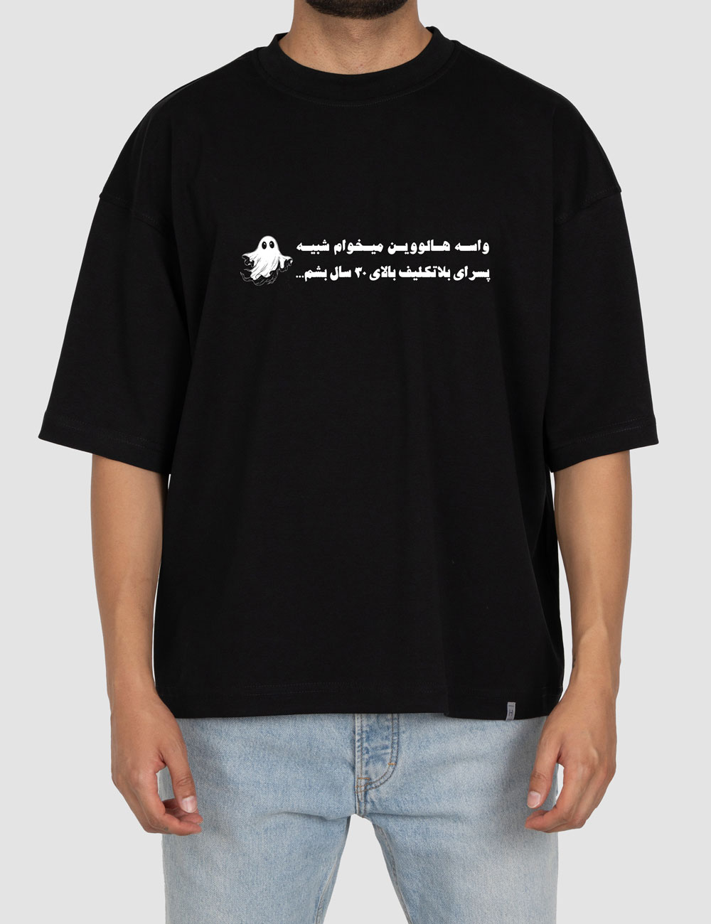 تیشرت باکسی روح خبیث یک نسخه هالووینی از برند هیوان، با چاپ طنزآمیز و مینیمال خودش، یکی از ترندهای خاص این فصل است. جملهی چاپشده روی تیشرت با شوخی به حال و هوای مجردی و هالووین اشاره دارد و حالتی طنازانه و خاص ایجاد میکند.