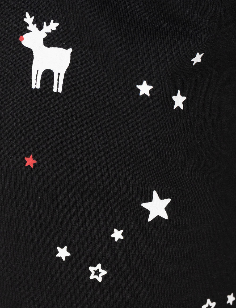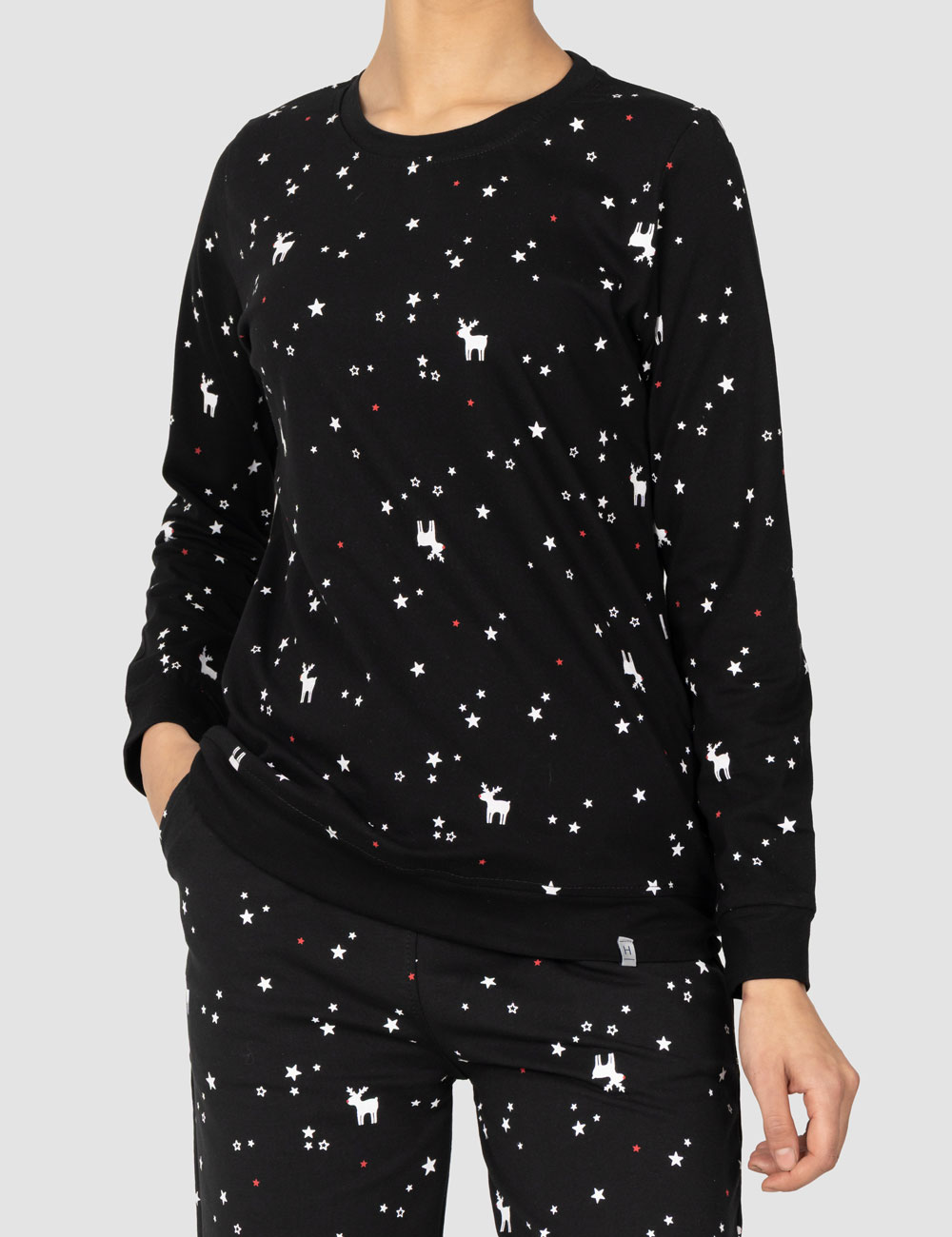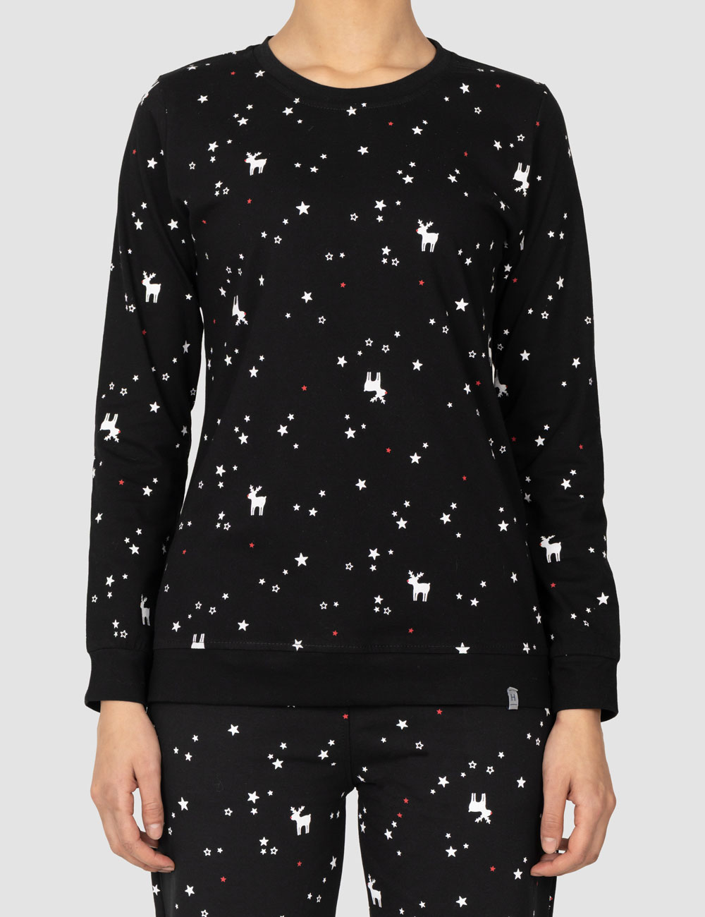 بلوز زنانه چاپدار ستاره و گوزن، با طراحی شاد و رنگ مشکی، انتخابی شیک و راحت برای استایل‌های روزمره است. چاپ ستاره‌های سفید و قرمز در کنار گوزن‌های سفید، جلوه‌ای جذاب و زمستانی به این بلوز بخشیده است. جنس پنبه‌ای نرم و راحت این بلوز، مناسب برای استفاده در تمام فصول است و راحتی را در طول روز به شما می‌دهد.