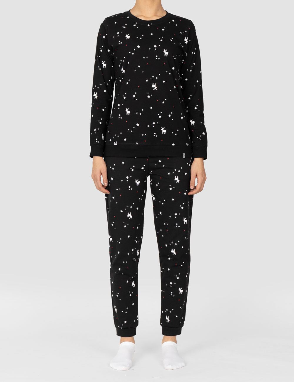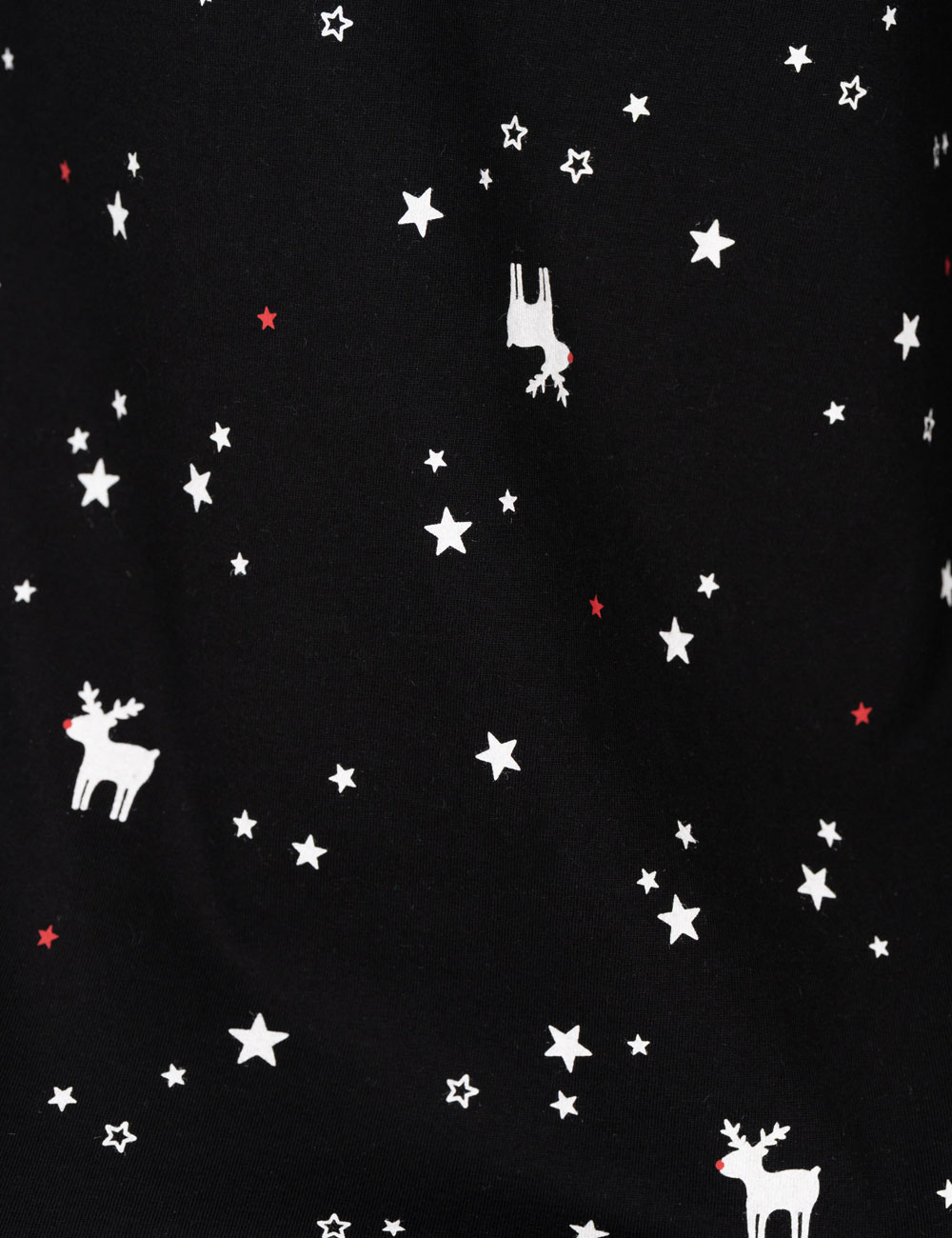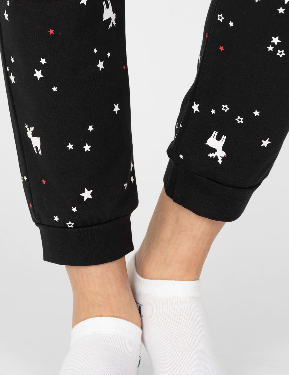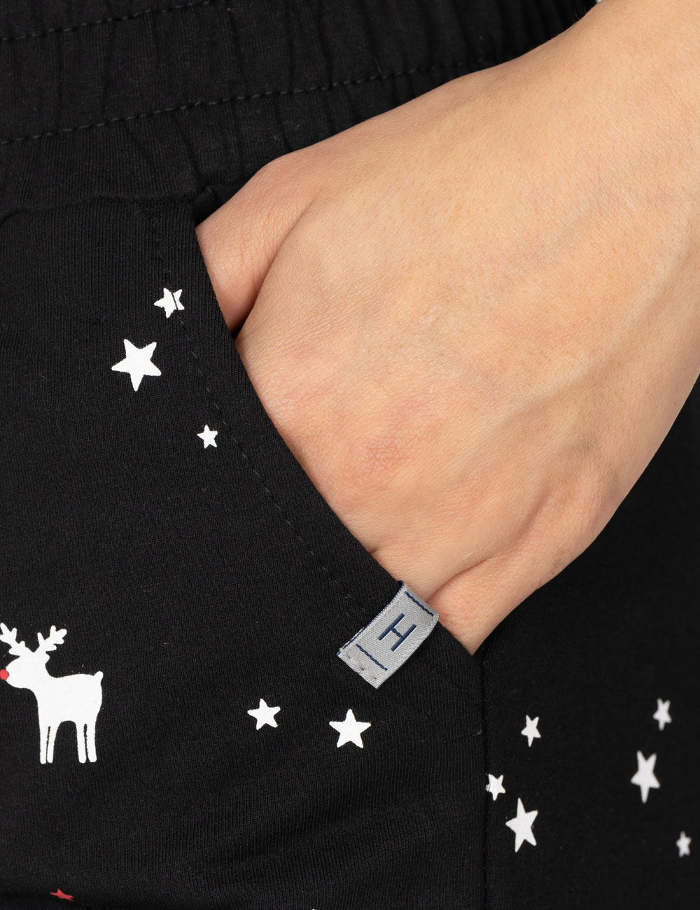 شلوار زنانه چاپدار ستاره و گوزن، با طراحی شاد و رنگ مشکی، انتخابی مناسب برای استایلهای راحتی و روزمره است. چاپ ستارههای سفید و قرمز در کنار گوزنهای سفید، جلوهای زیبا و زمستانی به این شلوار بخشیده است. جنس گلکسی نرم و راحت این شلوار، مناسب برای استفاده در تمامی فصول است و راحتی را در طول روز به شما میدهد.